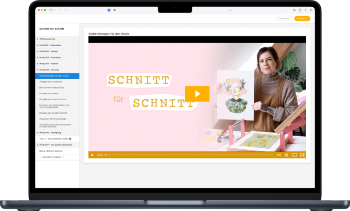 Und wenn du Lust hast, das Drucken Schritt für Schritt in deinem Tempo zu erlernen, dann ist mein Onlinekurs für Linoldruck Einsteiger perfekt für dich geeignet.