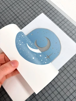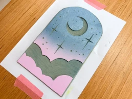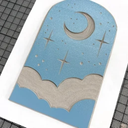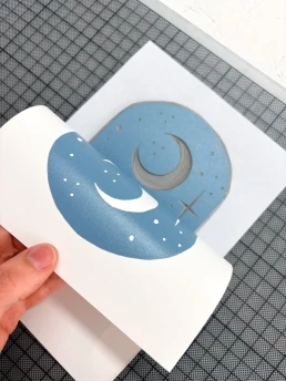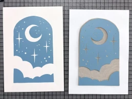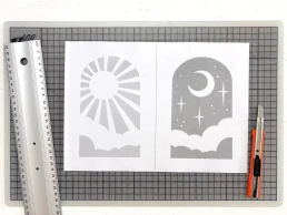 Starte klein. Gut geeignet sind Elemente, die „verzeihen“. Etwas Florales eignet sich oft gut. Für das Tutorial habe ich mich für ein Rundbogenfenster entschieden, aus dem ich ein paar Sterne, Wolken und einen Mond entferne, die dann im spätere Druck weiß erscheinen. Das Pendant dazu, die Sonne, ist noch etwas einfacher zu Schnitzen. Starte einfach mit dem Motiv, das dir besser gefällt.