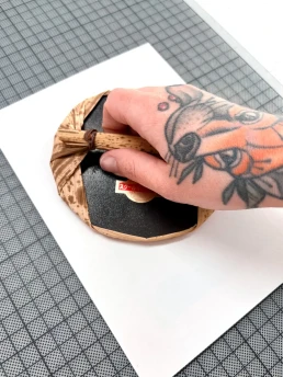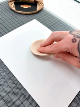 Starte mit dem japanischen Handreiber und bewege ihn mit kreisenden Bewegungen über das Druckpapier. Vorsichtig, um das Blatt nicht zu verschieben.